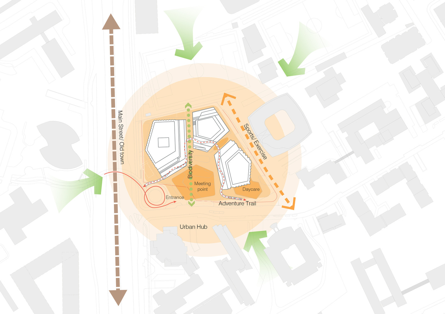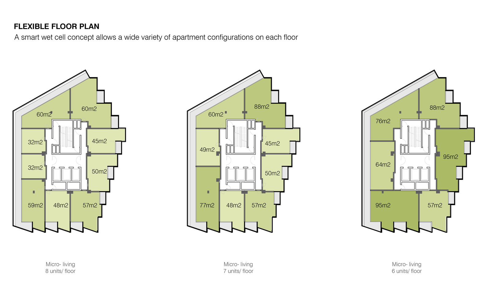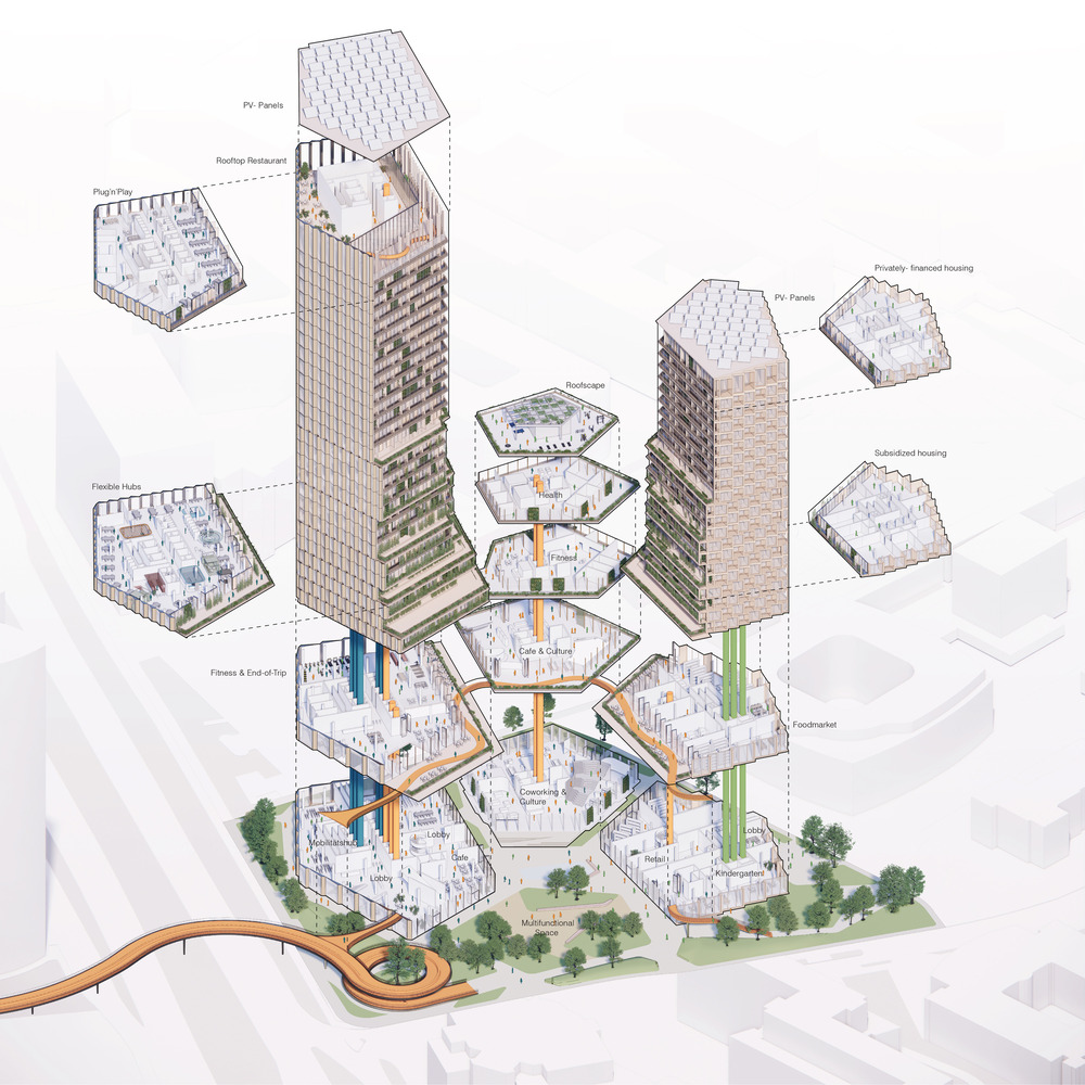 برج مسکونی، انواع مختلف آپارتمان ها را برای خانواده های گوناگون معرفی می کند. همچنین با به کارگیری یک مفهوم هوشمند، این امکان برای ساکنین فراهم شده که به صورت جداگانه آپارتمان خود را پیکربندی کنند و انعطافپذیری بیشتری را تجربه کنند. برج دوم فضاهایی را برای دفاتر متمرکز بر کارمندان به همراه ویژگی های اضافی مانند فضاهای مشترک برای تمرکز، مناطق تفریحی و فضای سبز در سراسر ساختمان ارائه می دهد. منظر اداری Plug'n'Play، با دفاتر سلولی و ساختارهای با پلان باز که در کل طبقه توزیع شده است، اجتماعی شدن و تعامل را تشویق می کند و در عین حال سازگاری و انعطاف پذیری را در پاسخ به نیازهای در حال تغییر یک فضای کاری مدرن ارائه می دهد.