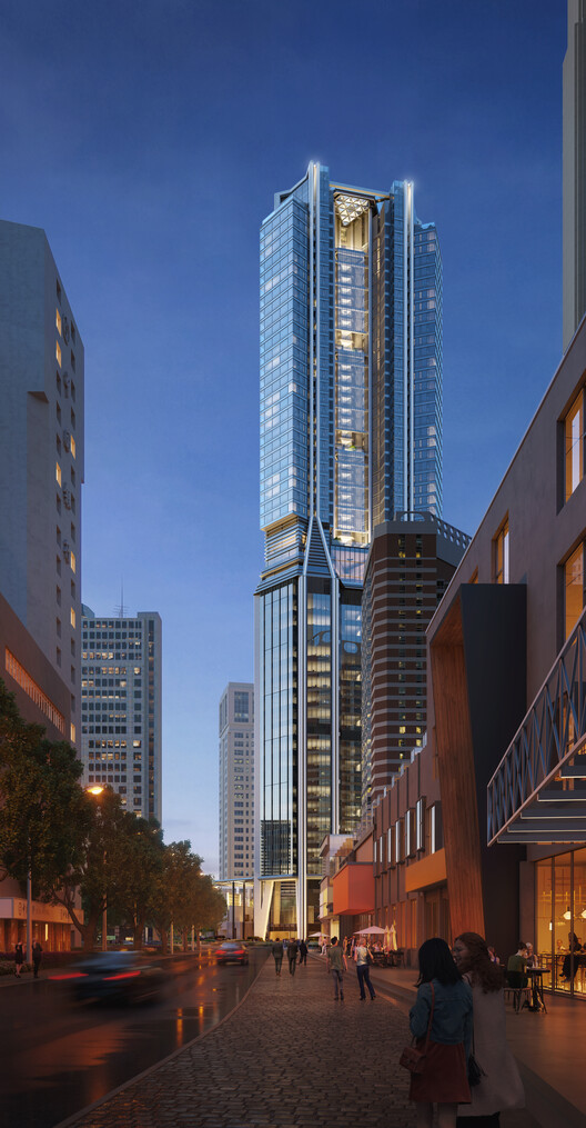 این برج دارای یک فضای عمومی بدون ماشین است که به محیط اطراف و اسکله مجاور متصل می شود. برای دستیابی به این هدف، مناطق پیاده کردن و تحویل در امتداد محیط بیرونی سایت طراحی شده است. در ضلع شرقی پروژه، یک میدان باز، یک گالری هنری، و یک باغ محوطه سازی شده قرار دارد که افراد بیرونی از ایستگاه متروی مجاور را جذب می کند. در پایین برج یک ردیف از فروشگاه ها که با سنگ های منطقه طراحی و با بافت ترکیب شده است، یک مقصد خرید جدید را در شهر به وجود آورده است .