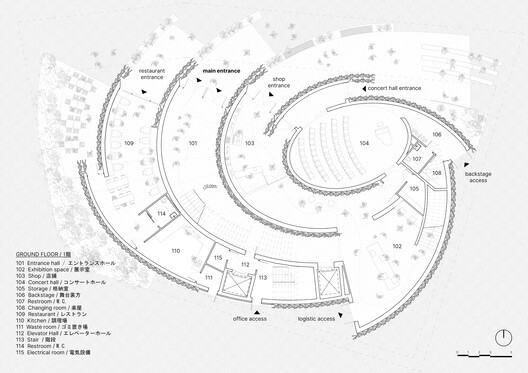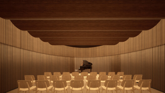 تأثیرات شکل هندسی از طریق دیوارهای مارپیچی پویا در ارتفاعات مختلف دیده می شود و این امر غنی سازی دانش ملی را به دنبال دارد. مقیاس متفاوتی از مارپیچ از هر نقطه دید آشکار میشود، که اجازه میدهد در ارتفاعات پایینتر، فواصل، نزدیکتر به بدن انسان مقیاس شود. در قلب پروژه، یک سالن کنسرت مرکزی وجود دارد که نماد قدرت فرهنگ است. پوسته بیرونی پروژه با چوب ماژولار ژاپنی پر شده است که ادای احترام به سنت است. تکرار یک عنصر ساده در طراحی مدولار، امکان بهینه سازی فرآیند ساختمان را فراهم می کند.