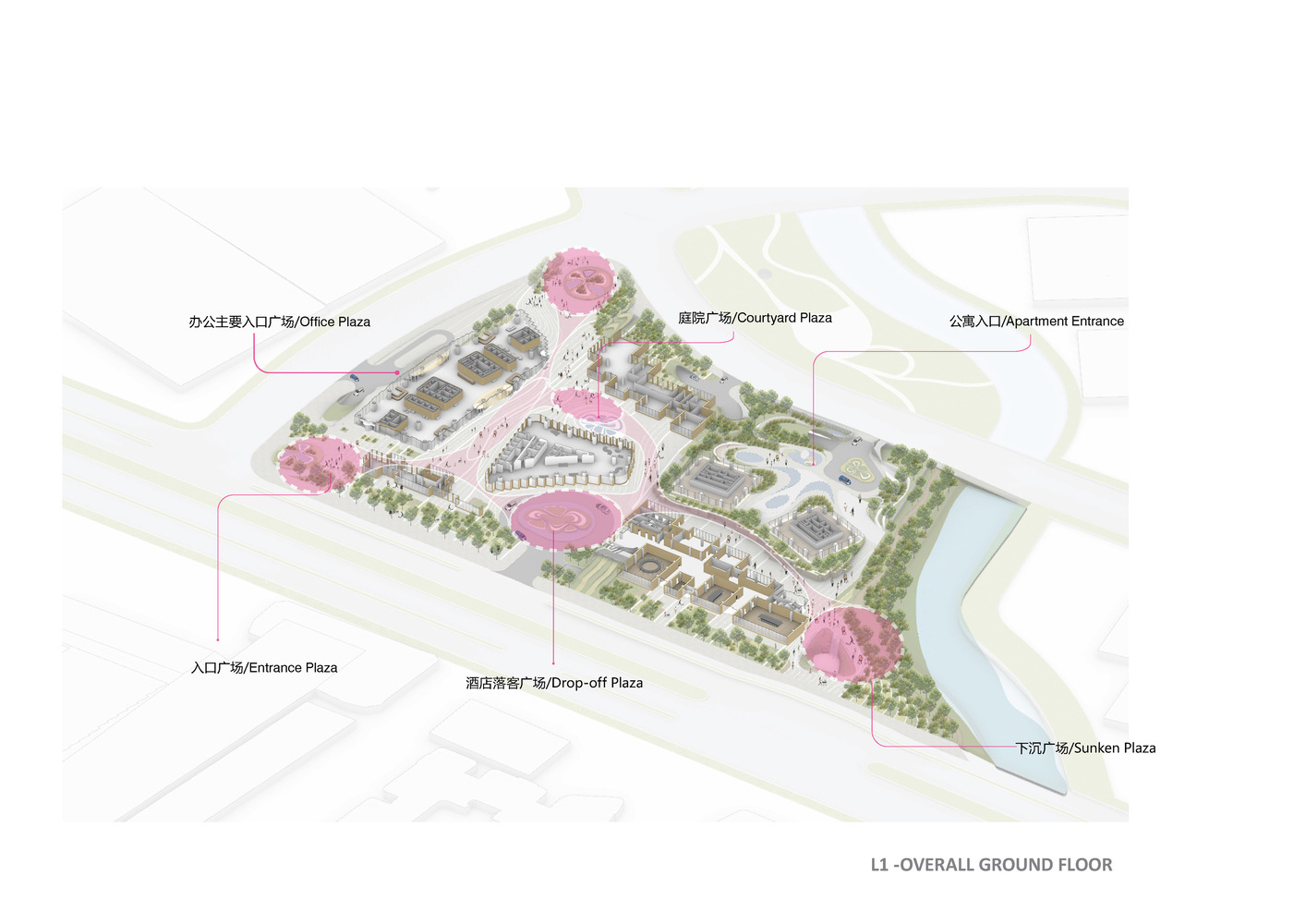 در سطح زمین، حجمهای معماری برای ارتباط بهتر با مقیاس انسانی، با واریانس افقی معرفی شدهاند تا به خیابان مجاور نیز متصل شوند. به گفته معماران، طراحی سکوها و میدان های سطوح پایین تر، از روستای باستانی لیانگژو در هانگژو الهام گرفته شده است. شکل بالکن، ساختمانهای سه طبقه، سکونتگاه روستایی را یاد آور می شود، در حالی که مرکز کنفرانس، واحدهای تجاری، سالن رقص هتل، و موزه هنرهای تصویری، حجمهای ویلا مانندی را به تصویر میکشند که در سایهبانی بزرگ پناه گرفتهاند. و همین منجر به تشکیل شبکه ای سیال از میدان ها و اتصالات عابر پیاده با مناطق نیمه باز می شود که محیطی لذت بخش را برای استراحت و تعامل ساکنان ایجاد می کند.