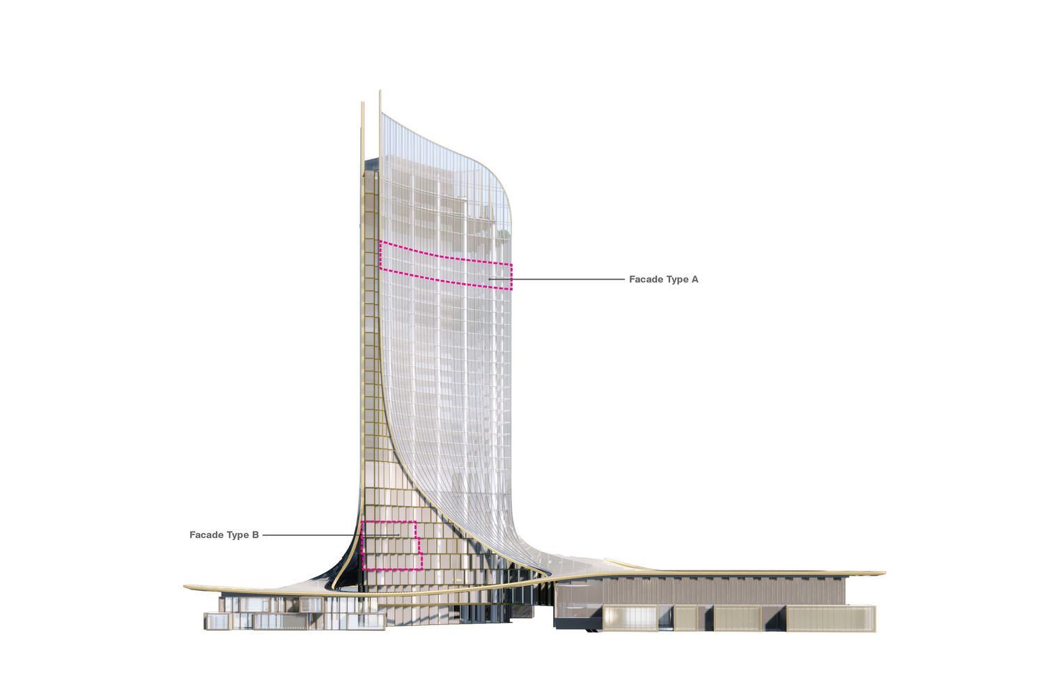 نماهای برج مرکب مرکزی با سایبان های شیشه ای به سمت میدان مرکزی نمایان می شود و شمایی از باز بودن و شفافیت ایجاد می کند. سایبان های بال مانند به سمت قسمت های زیرین قرار دارند تا ارتباطی بین حیاط داخلی و خارجی ایجاد کنند. شیشههای سایبانها به گونهای طراحی شدهاند که نور خورشید را منعکس میکنند و جلوهای درخشان شبیه آبهای رودخانه کیانتانگ ایجاد میکنند. فضاهای بیرونی، یک محیط سازگار با هر نوع آب و هوایی را ایجاد می کنند تا ساکنان را به تعامل و استراحت در فضاهای عمومی تشویق کند. سایبان شفاف همچنین نور روز را در داخل ساختمان به حداکثر می رساند، در حالی که باله های عمودی قرار داده شده از نفوذ گرمای بیش از حد جلوگیری می کنند.