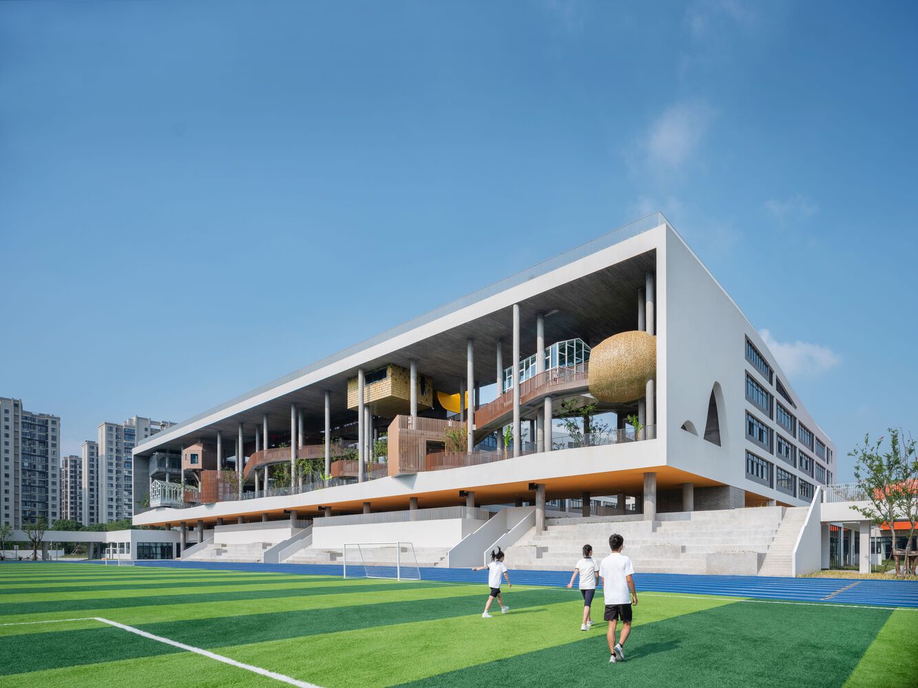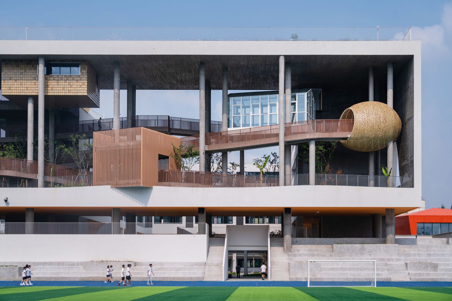 Huizhen که واقع در منطقه Jiangbei شهر نینگبو است، یک کاوش جسورانه در طراحی پردیس «اول کارایی» است. محوطه مدرسه شبانه روزی یک «جنگل شناور» با کلاس های درس است که در هر گوشه جنگل آویزان شده و با مسیرهای پرپیچ و خم به هم می پیوندند. خانه های درختی پراکنده، امکان فرار موقت دانش آموزان را از زیر بار مدرسه فراهم می کند. یک سطح شیب دار به سقفی با شیب ملایم منتهی می شود که به عنوان یک سالن سخنرانی در فضای باز و یک پارک روی پشت بام با امکانات ورزشی قابل استفاده برای عموم در آخر هفته قرار می گیرد و یک نوع جدید از گردشگاه معماری ایجاد می کند.