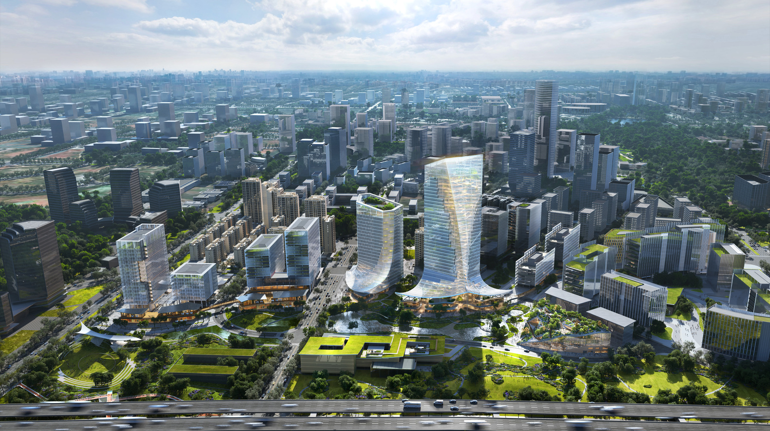این پروژه توسط گروه سرمایهگذاری فناوری پیشرفته چنگدو توسعه داده شده است و میزبان شرکتهایی خواهد بود که بر روی توسعه 5G، هوش مصنوعی، کلان داده و سایر زمینههای فناوری پیشرفته متمرکز هستند. این پروژه در جنوب شرقی چنگدو واقع شده است، جایی که گسترش شهری و یک منطقه روستایی تپهای به هم می رسند، و این طراحی تحت تأثیر این تلاقی شهر و طبیعت است. علاوه بر این، این طرح با ابتکار «پارک شهر» دولت چنگدو هماهنگ است. این ابتکار شامل ترکیب عناصر سبز است که از فضاهای سبز مجاور به سازه ها می رسد. در واقع، برج دارای یک باغ آبشاری سرسبز است، در حالی که مرکز فرهنگی دارای یک بام سبز حیاتی است.