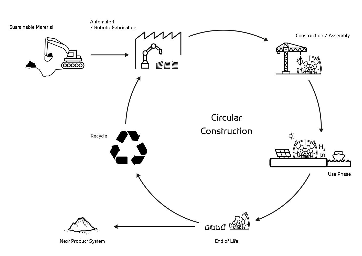 ماژول های به دست آمده که کاملاً قابل بازیافت هستند، در محل به صورت خشک مونتاژ می شوند و زباله های ساختمانی را به حداقل می رساند. این طرح با همکاری گروه تحقیقاتی محاسبات و طراحی ZHA (ZHA CODE) با گروه تحقیقاتی Block و Incremental3D توسعه یافته است. این تیم همچنین بر روی سازههای آزمایشی مانند پل استریاتوس Striatus در ونیز و پل فونیکس Pheonix در مرکز نوآوری هولسیم در لیون همکاری کردهاند که قابلیت سازههای پرینتشده سه بعدی را نشان میدهد که دارای مزیت کاهش مواد ساختاری مورد نیاز تا 50 درصد، امکان جداسازی و بازیافت تعبیه شده است.