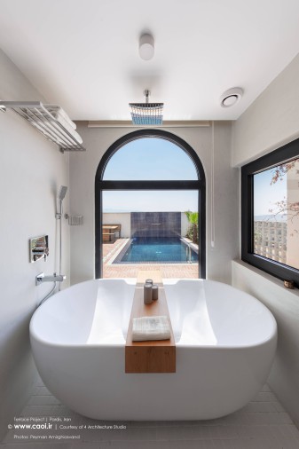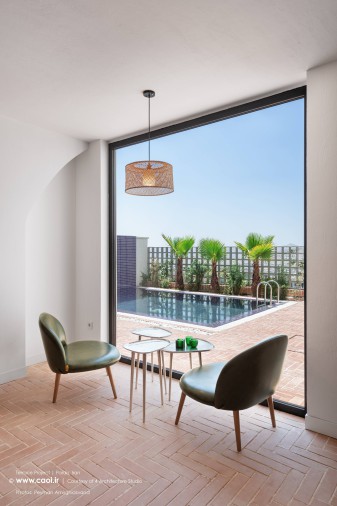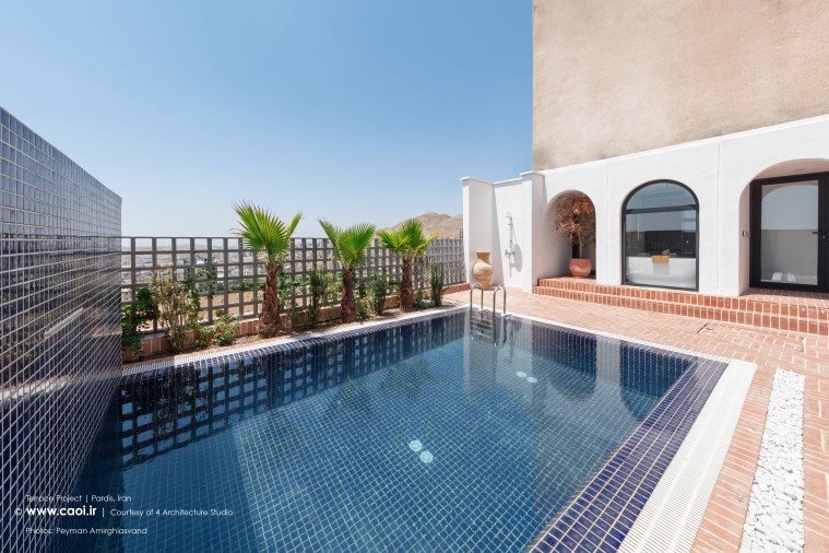 در اواسط پروژه با پیشنهاد ما، کارفرما با احداث یک استخر چهارفصل مناسب در محوطه تراس موافقت نمود. پس از بررسی های ما با مشاوران سازه و تایید همه کارشناسان مبنی بر اصولی بودن احداث استخر، وارد مرحله طراحی استخر شدیم. ما سه کد ارتفاعی مختلف در ارتباط بین فضاهای داخلی و تراس داشتیم و برای اینکه به یک طراحی منسجم در پاسخ به همه چالش ها و نیاز هایمان برسیم به یک راه حل عملکردی برای اتصال بهینه فضاهای درون و بیرون به یکدیگر نیاز داشتیم.