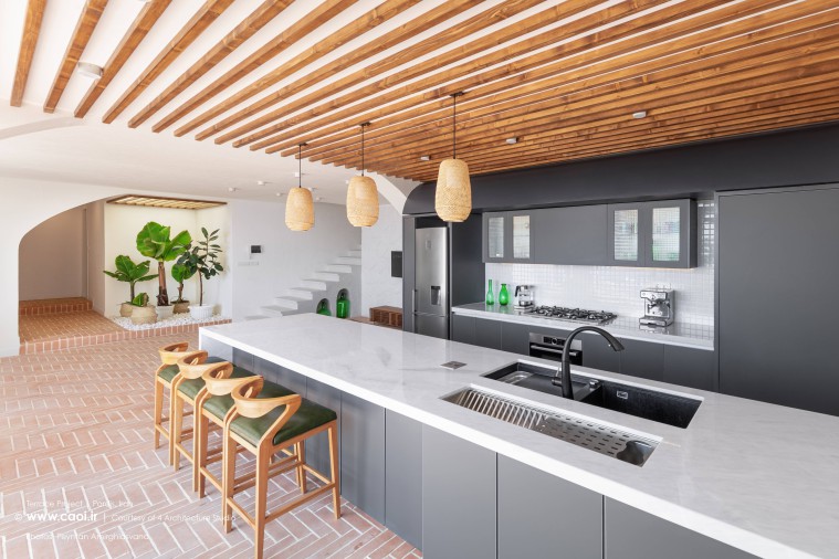 همسان سازی تراز ارتفاعی نشیمن، آشپزخانه و تراس (که شامل استخر و ملحقات آن نیز میگردد)، به منظور متصل شدن فضای مسقف و فضای باز و ایجاد یک فضای رویداد همگن.