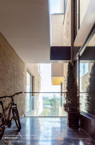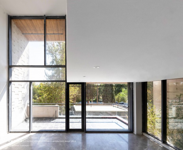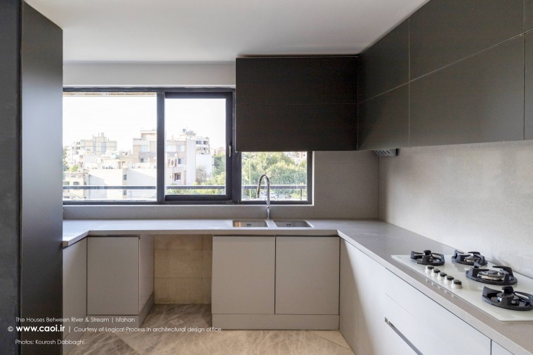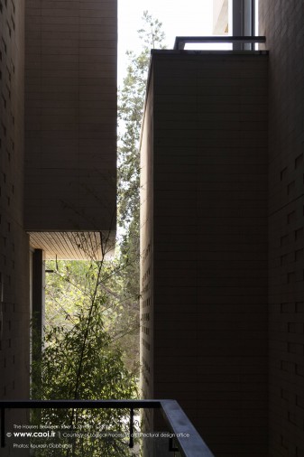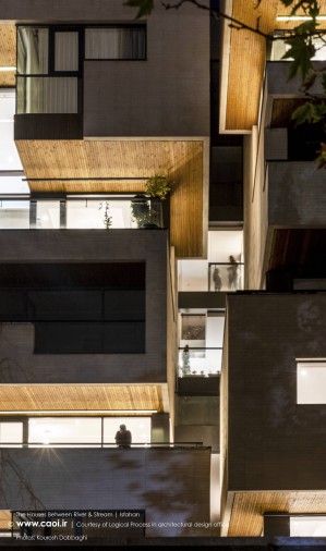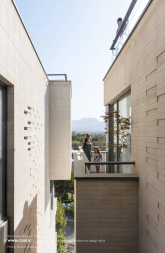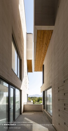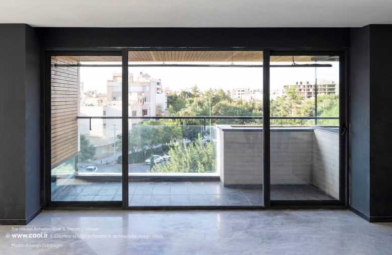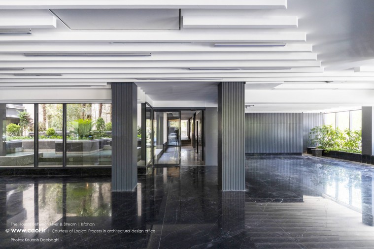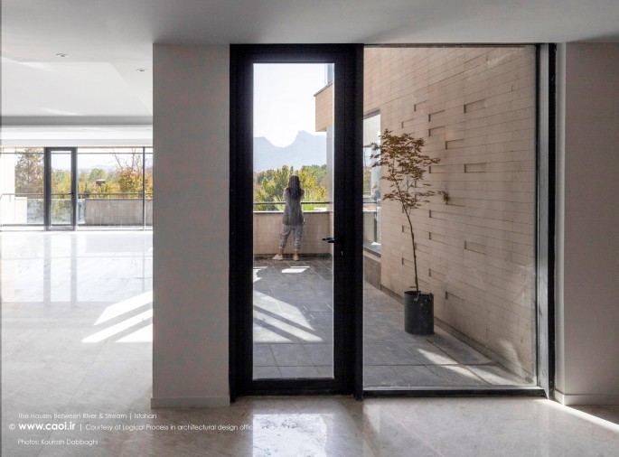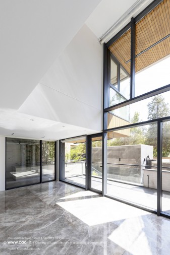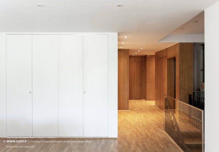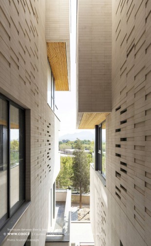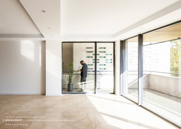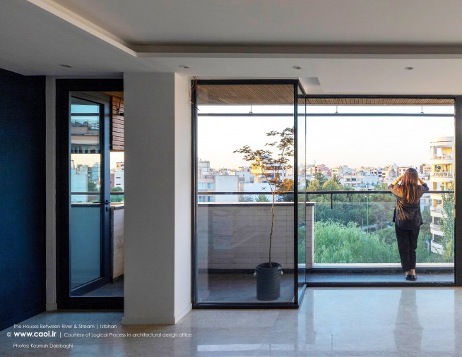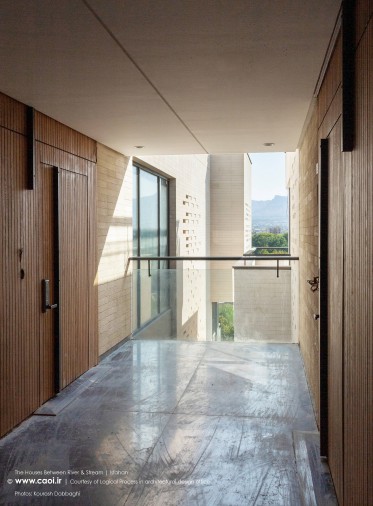 در نقطه ای شگفت انگیز ،مادی نیاصرم به فاصله پهنای یک پلاک به زاینده رود نزدیک می شود، خانه های میان رود و مادی همینجا شکل می گیرند. جایی میان زاینده رود و مادی نیاصرم، ساختمان توده ای چگال و بسته نیست، نسیم رود منافذی در حجم ایجاد می کند و حیاط میانی، شفاف و باز به زاینده رود می پیوندد.