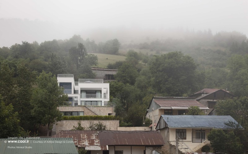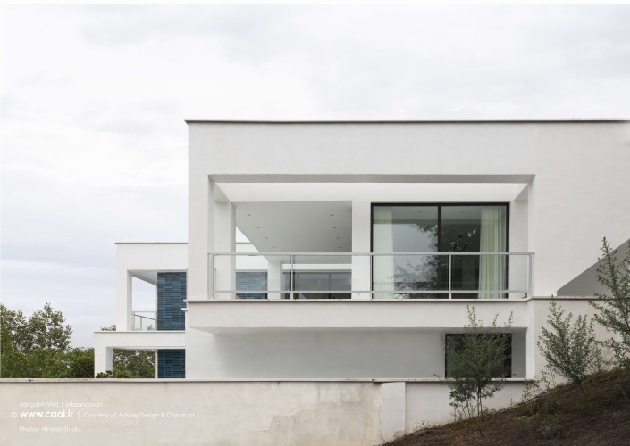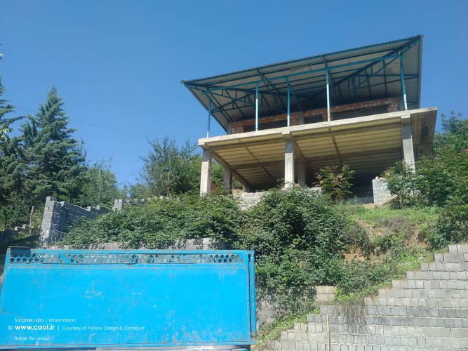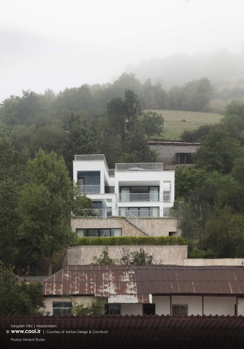 در طراحی پروژه ی ویلایی سنگده، با ساختمانی دو طبقه بر روی توپوگرافی با شیب تند و چشم اندازی زیبا مواجه بودیم که نسبت به سطح خیابان حدود هفت متر بالاتر بود. خواسته ی کارفرما افزودن بخش الحاقی به بنا (با حداقل محدودیت دید به منظر مطلوب) برای توسعه ی برنامه ی فیزیکی شامل دسترسی های عمودی با آسانسور، پارکینگ مسقف، سوییت سرایداری و ... بود که علاوه بر محدودیت های سازه ای (عدم امکان جانمایی آسانسور در داخل حجم موجود و الزام به فاصله ی حداقلی در سازه)، فرصتی برای شکلگیری ایده ی طراحی فراهم آورد. گویی بخش الحاقی بایستی نظام هندسی ساده ی فرم اولیه را برهم زده و خود را به آن تحمیل کند. ازآنجاییکه این الحاق حجم از سطح خیابان شروع میشد، در وضعیت جدید با بنایی چهارطبقه روبرو می شدیم که مقیاس آن در بافت منطقه ناهماهنگ می نمود. برای حل معضل درشت دانگی و نامتناسب بودن پروژه، بنا با برشی افقی بر روی پایه ای سنگی، صلب و در هماهنگی ابعادی-حسی با زمینه ی خود قرار گرفت. انقباض بصری حجم پروژه با ایده ی حذف سقف شیبدار دنبال شد که علاوه بر ظرفیت سطح بام در دید پانوراما به طبیعت اطراف، امکان ارتباط ساختمان را با زمین کوچک شمالی در ارتفاع بالادست از طریق پل مهیا نمود (با توجه به معضل نورگیری فضا در سمت شمال پروژه، ارتفاع حیاط شمالی کاهش یافت و برای گسترش تراس شمالی نیز از صفحه ی مشبک استفاده شد).