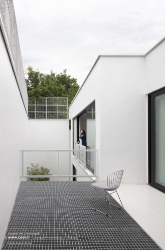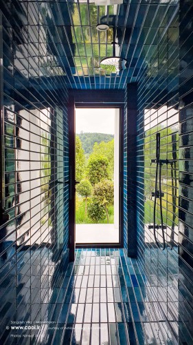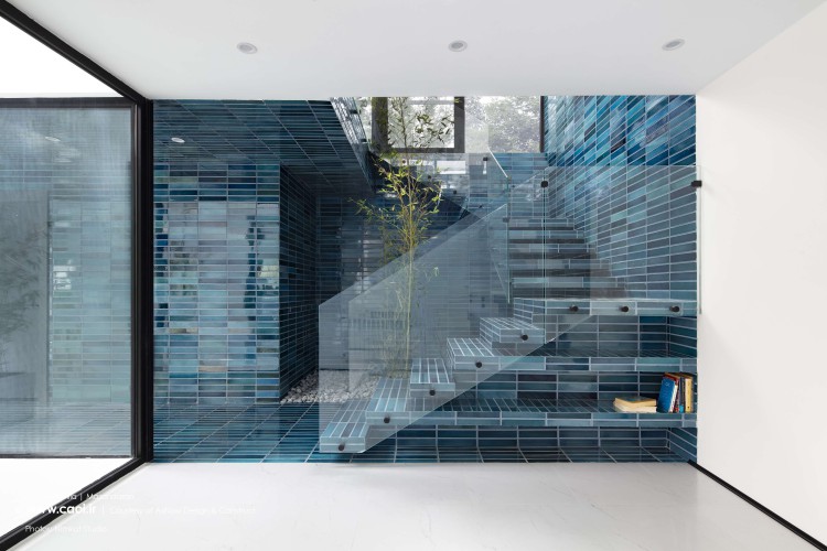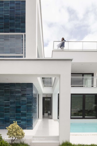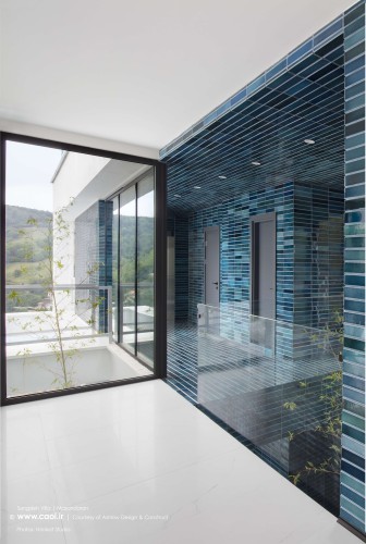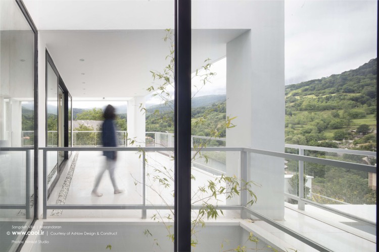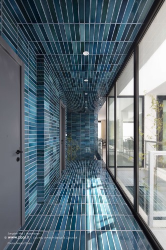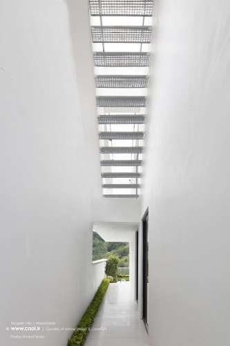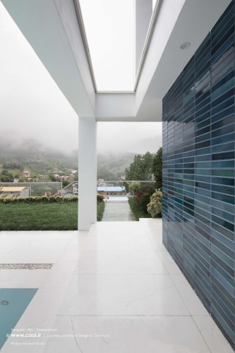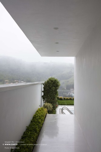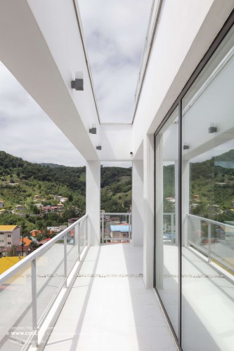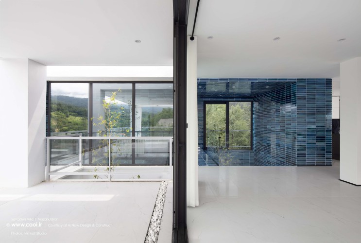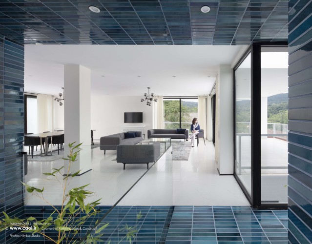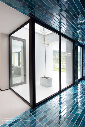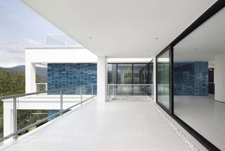 در ادامه آنچه ایده ی شاخص پروژه را بیان می کند، رسوخ و امتداد افقی بخش الحاقی خارجی به فضای داخلی است. گویی جعبه ی نوپا که از دل طبیعت برآمده و کاشی های سبز-آبی که رنگ خود را وامدار آبی آسمان و سبزی طبیعت هستند، مخاطب را در فضای الحاقی (فضاهای حرکتی و خدماتی) از مرزهای بیرونی تا رسیدن به فضاهای اصلی میزبانی می کنند. این جعبه ی فضایی بیرونی-درونی خلق شده، (علی رغم برنامه فیزیکی فشرده از جانب کارفرما) بهترین فرصتی است که امکان ارتباط عمودی پروژه را در مقطع بوجود آورده و پلکان تندیسی سعی در استفاده ی حداکثری از این غنیمت دارد. تاثیر پرقدرت کاشی های سبز-آبی در کنتراست با سفیدی دیوارها تقویت می شود و سعی در بجا گذاشتن خاطره ی خود، در ذهن بیننده ی دور و نزدیک دارد. در تکمیل ایده ی نهایی حجم، سیستم شبکه ای تیر و ستون های سازه ای که از جهتی خود را در حجم ایوان به نمای بیرونی پروژه تحمیل کرده اند و از سوی دیگر پتانسیل بالقوه ای برای قاب کردن مناظر اطراف در خود نهفته دارند، در قالب پوسته ای سبک و متخلخل کل حجم بنا را در برمیگیرند. پوششی که سعی دارد به آرامی، مکعب الحاقی را همچون موجودیتی نوپا و پذیرفته شده در آغوش حجم اصلی جای دهد.