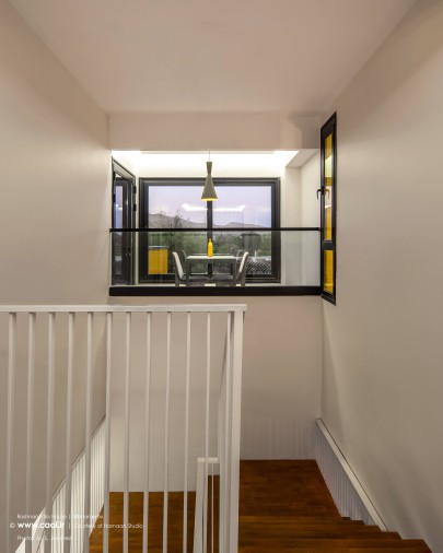 پیش از هرچیز با حل مسائل اسکلت ازپیشموجود سروکار داشتیم. طرح دواشکوبۀ پیشین با تفکیک قاطع دو طبقه در نما، بسیاری از ارتباطهای بصری درون و بیرون را که منظر طبیعی چشمگیری هم داشت، الکن کرده بود. به همین دلیل در قدم اول در طرح تازه این خط تفکیک برداشته و دید به بیرون بازتر شد. وُیدی که در سقف وجود داشت، تا پایین گشوده شد و نقش یک «میانخانه» را گرفت. میانخانهای که ستون فقرات مفصلبندی فضایی داخل است و به جای آنکه فضاهای عمومی و خصوصی را در تفکیکی قاطع ببیند، میان آنها یک طیف برقرار میکند و به آنها قوام میدهد. طراحی و الحاق ورودی جدید و ایجاد پل غلامگردشگونهای که در اشکوب دوم میچرخد نیز در جهت همین پیشروی و پرداختهترکردن مفصلبندیهای اسکلت نهبخشی پیشین است. مفصلبندیهایی که هم جریان زندگی را متعادلتر و متناسبتر میکند، هم تجربۀ زیستن در کنار کوه و درخت و حضور در یک منظر طبیعی را محققتر میکند.