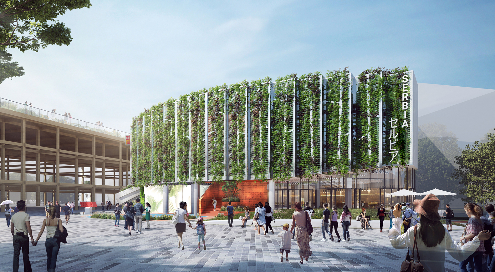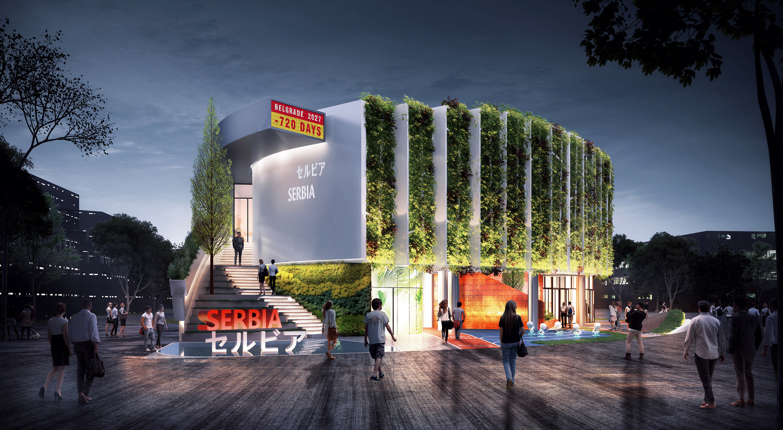 این پروژه، یک جزء "شناور" را به شکل یک نمای سبز مرتفع به نمایش می گذارد. این حرکت، طبقه همکف نمایشگاه را باز می کند و امکان گردش آزادانه و امکانات عمومی را فراهم می کند. سپس مسیر اکتشاف بازدیدکنندگان را مستقیماً از طریق یک پلکان شهری به سطح 2 هدایت میکند، جایی که نمایشگاه مضامین تکرار شونده در آن قرار دارد. این بخش "صربستان سرزنده" نام دارد. با اشاره به نمایشگاه آینده بلگراد 2027، نمایشگر تعاملی، سرزندگی و خلاقیت را تشویق می کند.