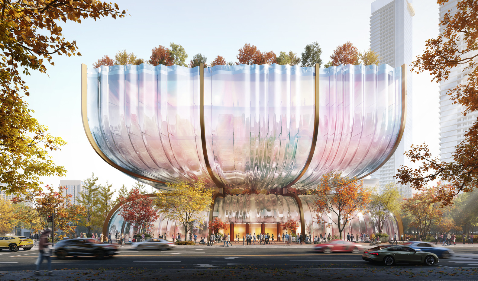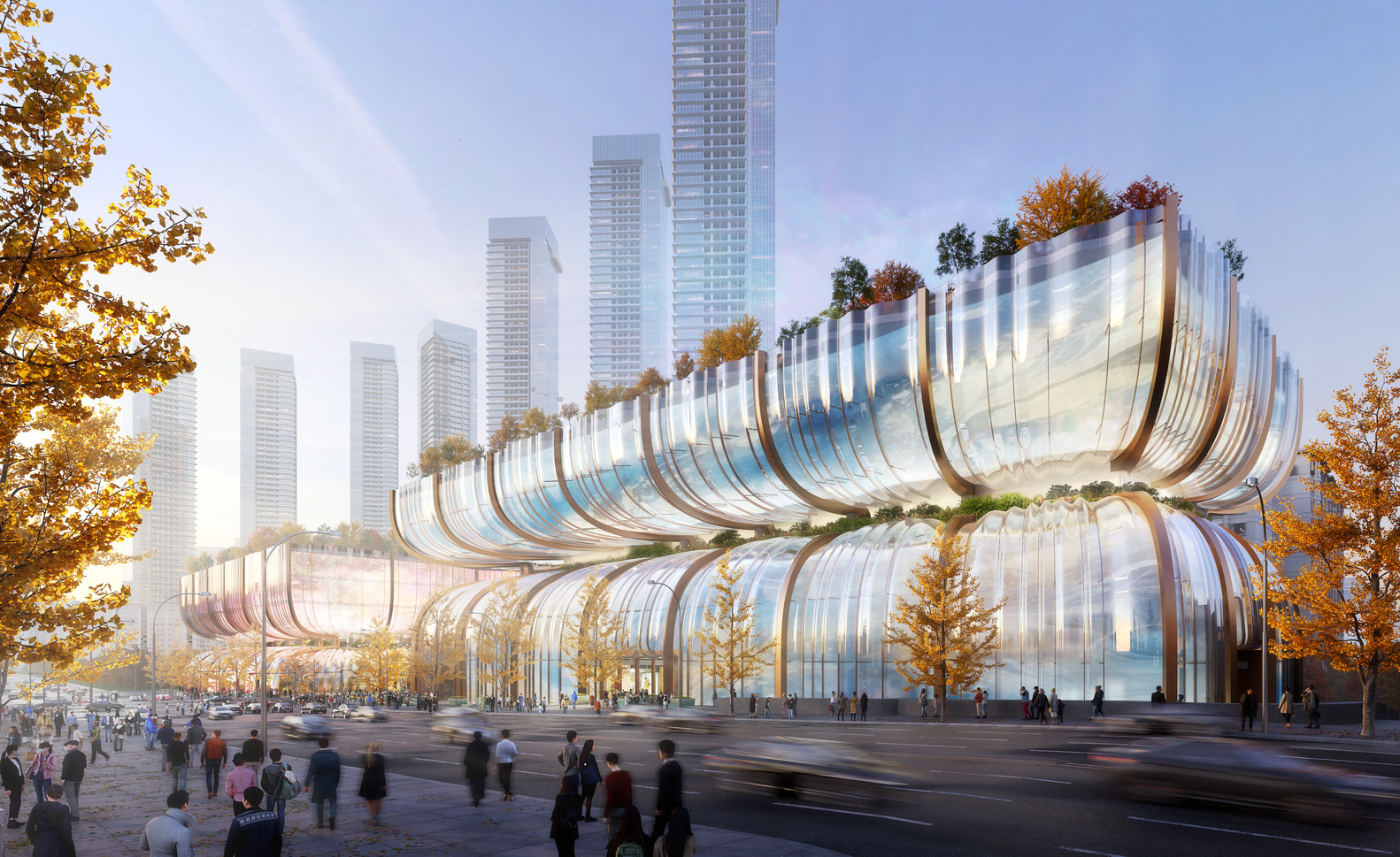 این گالری از دو ساختار دوقلو یکسان اما متقارن تشکیل شده است که در زیر زمین توسط یک مترو به هم متصل شده اند. شبحهای آنها در بالا، شبیه ساعتهای شنی مواج است، در حالی که گردنهای کوچکتر داخل، بهعنوان مکانهای عمومی سرسبز عمل میکنند. علاوه بر این، در سطح سکو، اشکال منحصربهفرد سازهها، منظرههای رودخانه را هنگام نگاه کردن به داخل و بین ساختمانها تنظیم میکنند.