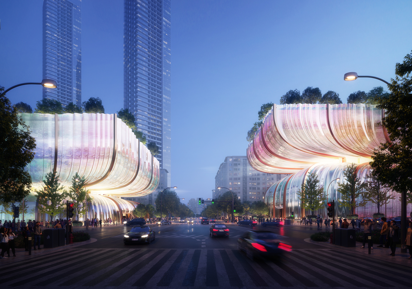 راهروهای بزرگ و پر نور ورودی متروی جدید، مهمانان را به دو پلازای محوطه سازی شده در سطح زمین هدایت میکنند. آنها به سمت یک منطقه باز در طبقه وسط که پر از غذاخوری، فروشگاه و کافه است، هدایت می شوند. همراه با نمای شیشه ای، پشت بام های باز تازه نصب شده با گیاهان فراوان، فضای سبز اضافی و چشم اندازها و بازتاب های مختلف شهر را به وجود می آورد. مناطق خارجی به گونه ای طراحی شده اند که عناصر طبیعی را در طول سال با انتخاب گیاهان بومی و محوطه سازی دقیق فراهم کنند. با توجه به پوسته دولایه، هر دو ساختمان سازگارتر با محیط زیست هستند و هدف آن ها چشمگیرتر کردن تغییر منحصر به فرد بین روز و شب است.