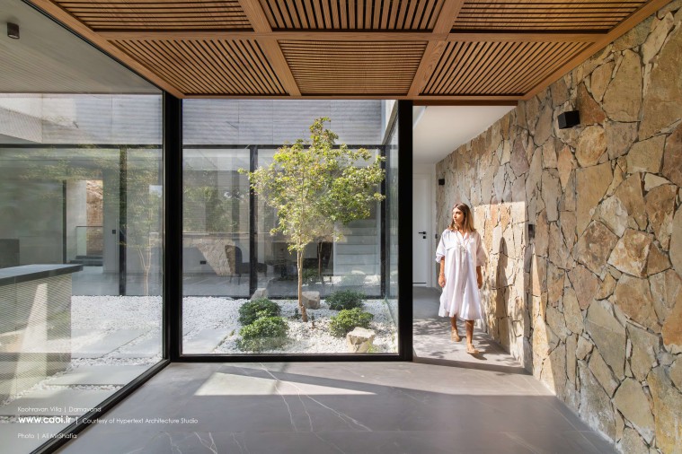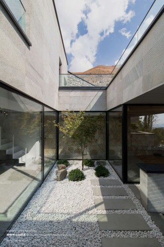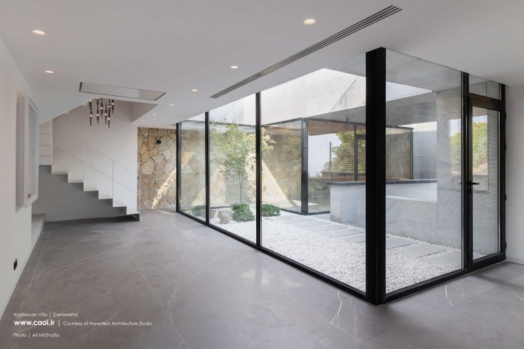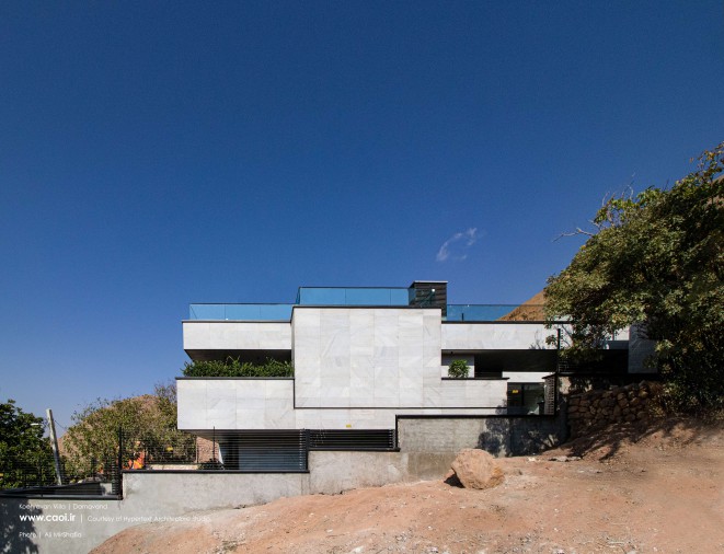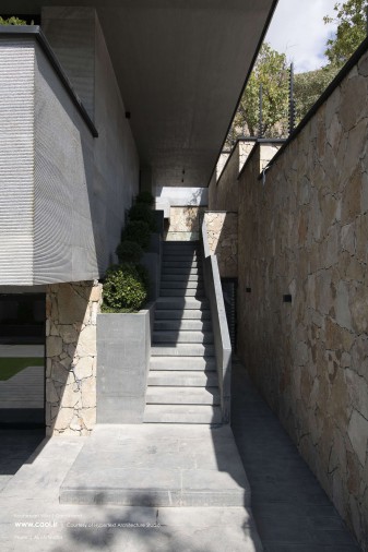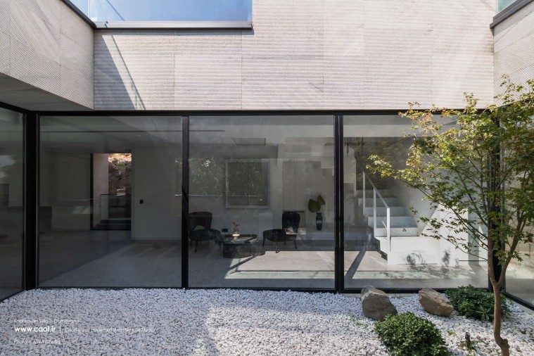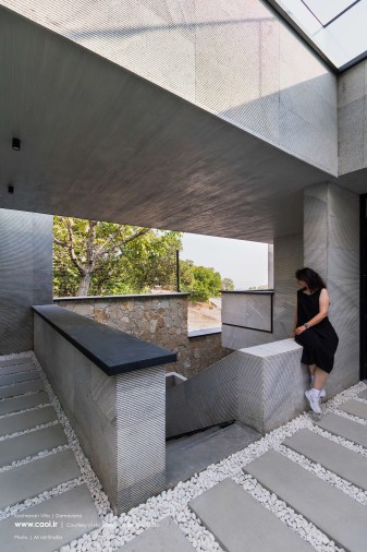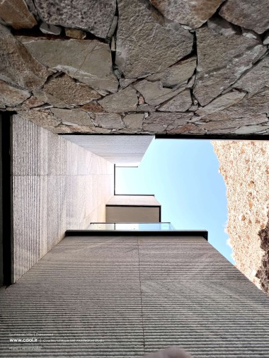 همجواری توده و خاک تامین نور و دیدومنظر برخی از فضاهای سکونتی را در معرض آسیب قرار داد؛ به همین منظور توده را از ضلع جنوبشرقی خالی کردیم. فضای خالی حاصل را در سه تراز موجود به هم متصل کردیم به طوری که در تراز پایینی پلکان اصلی پروژه، در تراز میانی حیاط مرکزی و در تراز بالایی آتریوم را جانمایی نمودیم. ارتباط میان دوگانه زمین پلهای و بنا از طریق فضای خالی پیوسته میانی برقرار شد. براساس همین دوگانهگی متریال زمین پلهای را از سنگهای به دستآمده از خاکبرداری انتخاب کرده و در مجاورت آن برای متریال ساختمان از سنگ سفید خراشیده شده استفاده کردیم تا بتوانیم تاکید مضاعفی بر دوگانه زمین و بنا به وجود آوریم.