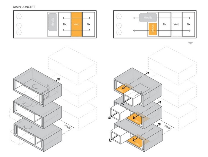 حجم ثابت ساختار کلی، فضای باز void مرکزی ، حجم ثابت و متحرک به ترتیب، 4 بخش اصلی این پروژه را شامل می شوند. هنگامی که جعبه های گردش کننده بسته می باشند، ساختمان نور خورشید را از طریق فضای باز void مرکزی دریافت می کند.این فضا نیز دو حجم ثابت طرفین را به واسطه ی پل های معلق به هم متصل می سازد.