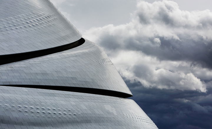 نمای بیرونی ساختمان با چهار نوار رقصنده و یک پوسته ی شیشه ای منحنی شکل طراحی شده است.